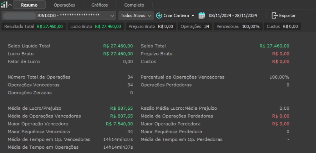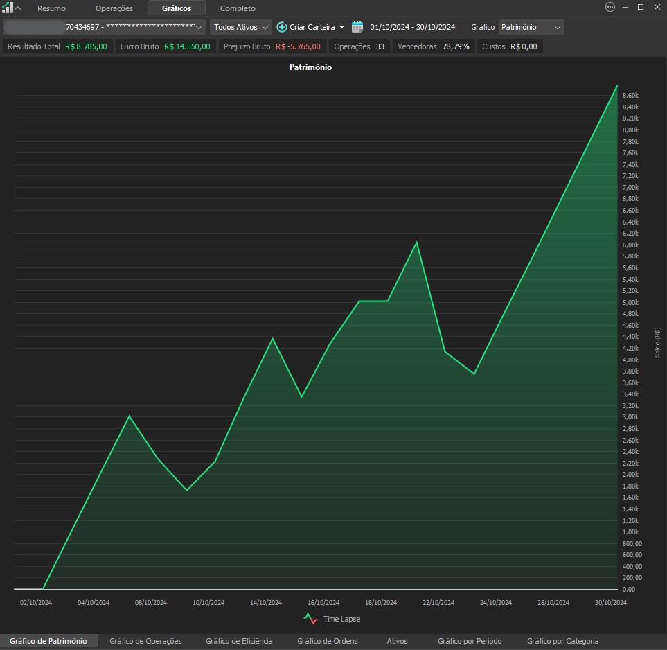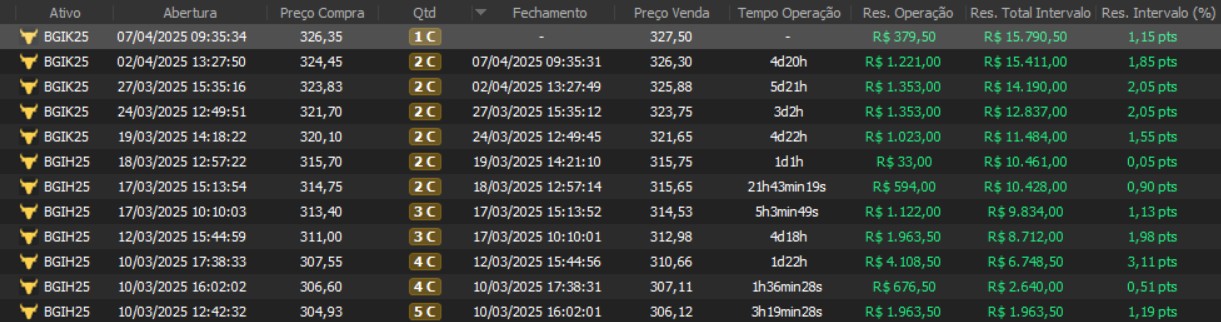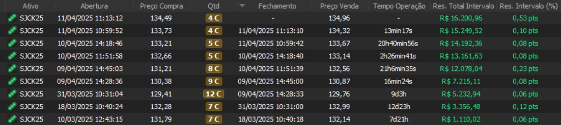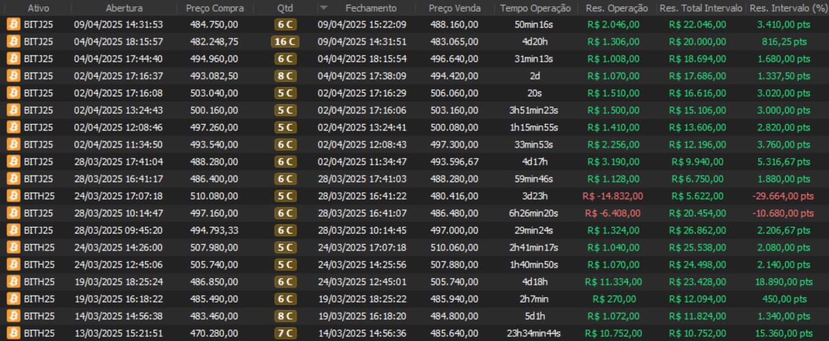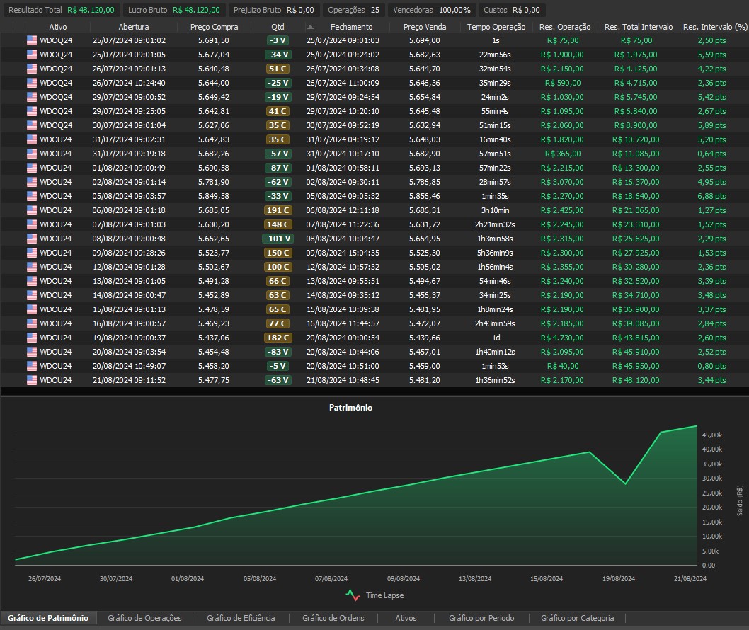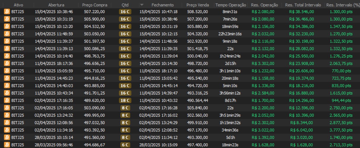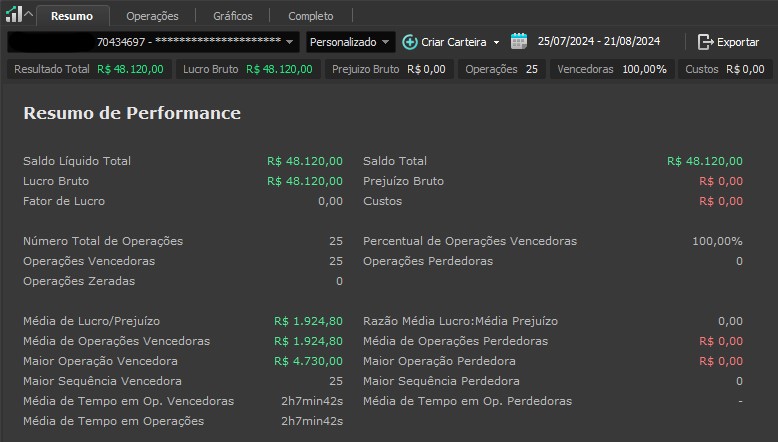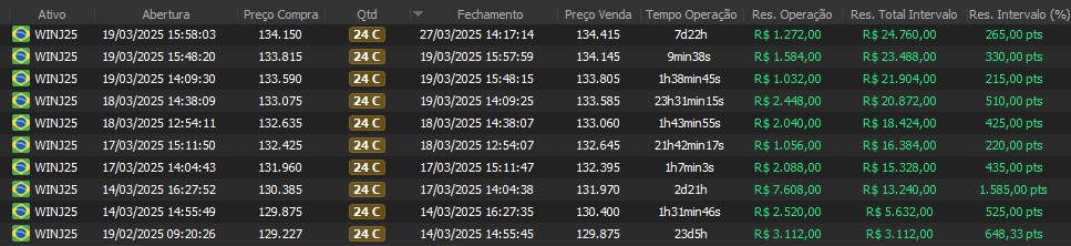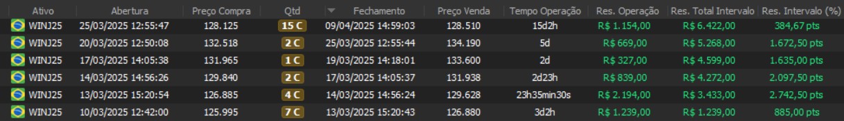 "Os resultados abaixo foram apurados em janelas reais, com capital estruturado em arquitetura híbrida: apenas uma fração é utilizada como margem operacional, enquanto o restante permanece em renda fixa de alta liquidez, contribuindo com juros no resultado total. Isso permite executar volatilidade com disciplina, manter governança de risco e reduzir a dependência de 'all-in' emocional."