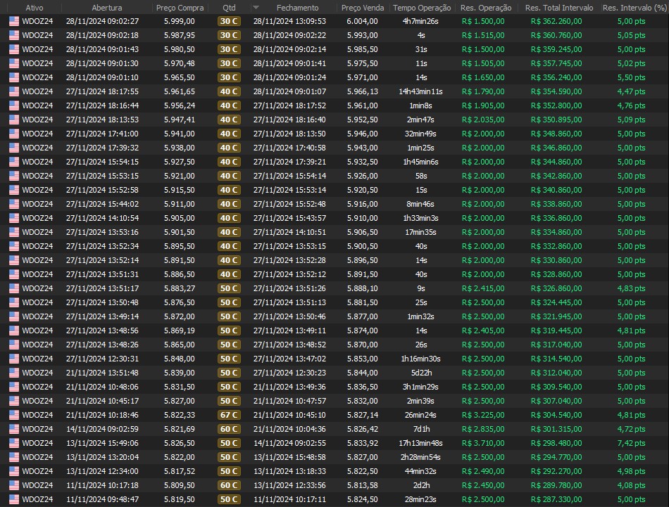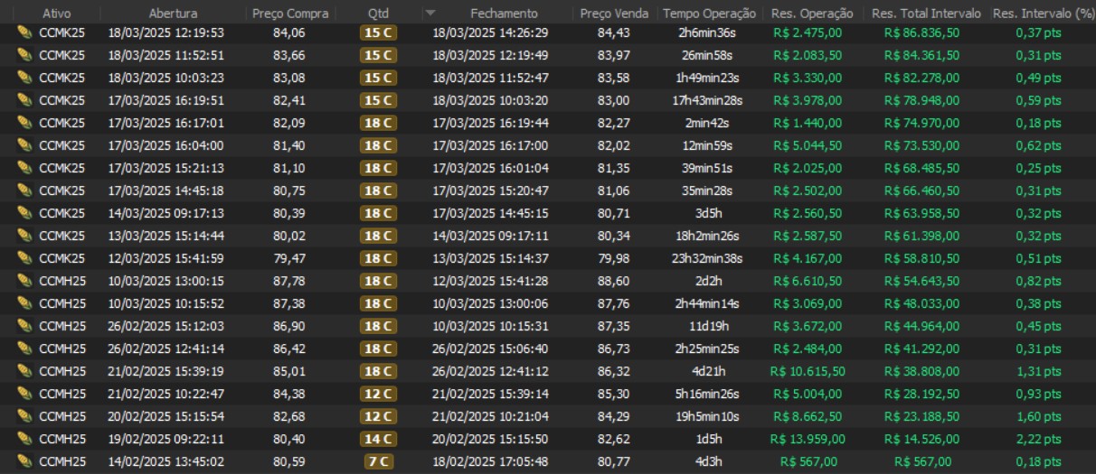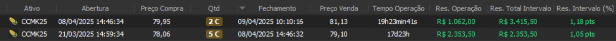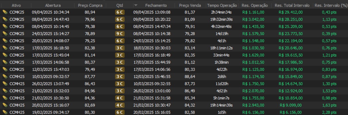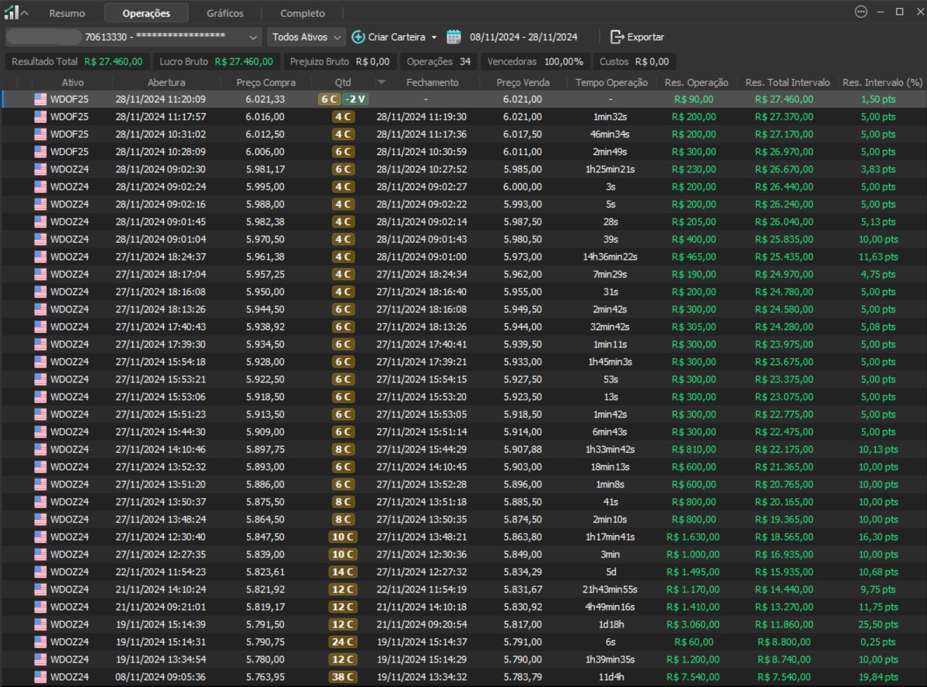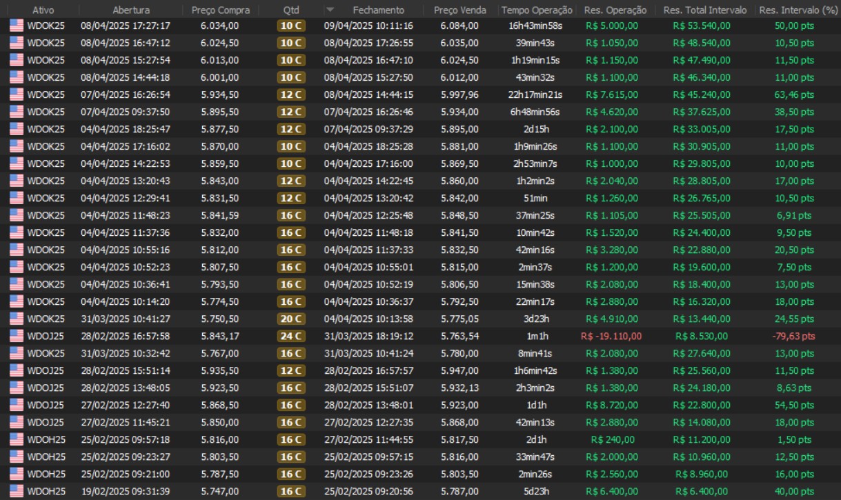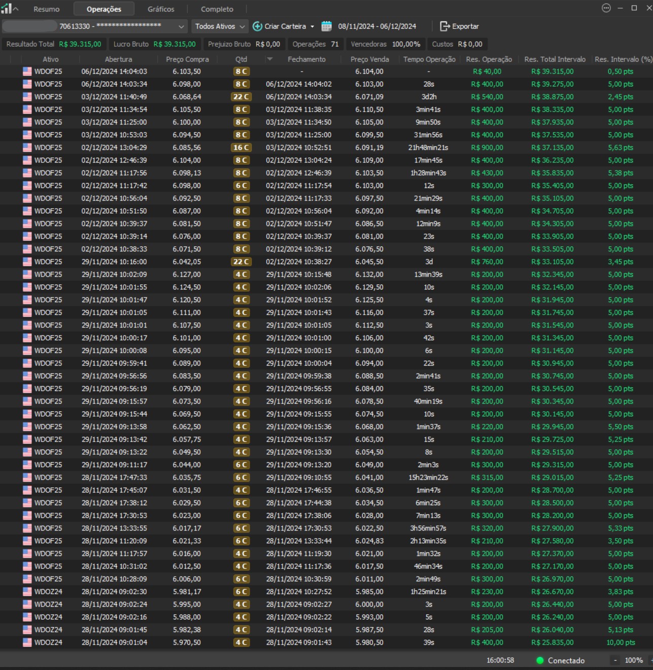 "Os resultados abaixo foram apurados em janelas reais, com capital estruturado em arquitetura híbrida: apenas uma fração é utilizada como margem operacional, enquanto o restante permanece em renda fixa de alta liquidez, contribuindo com juros no resultado total. Isso permite executar volatilidade com disciplina, manter governança de risco e reduzir a dependência de 'all-in' emocional."