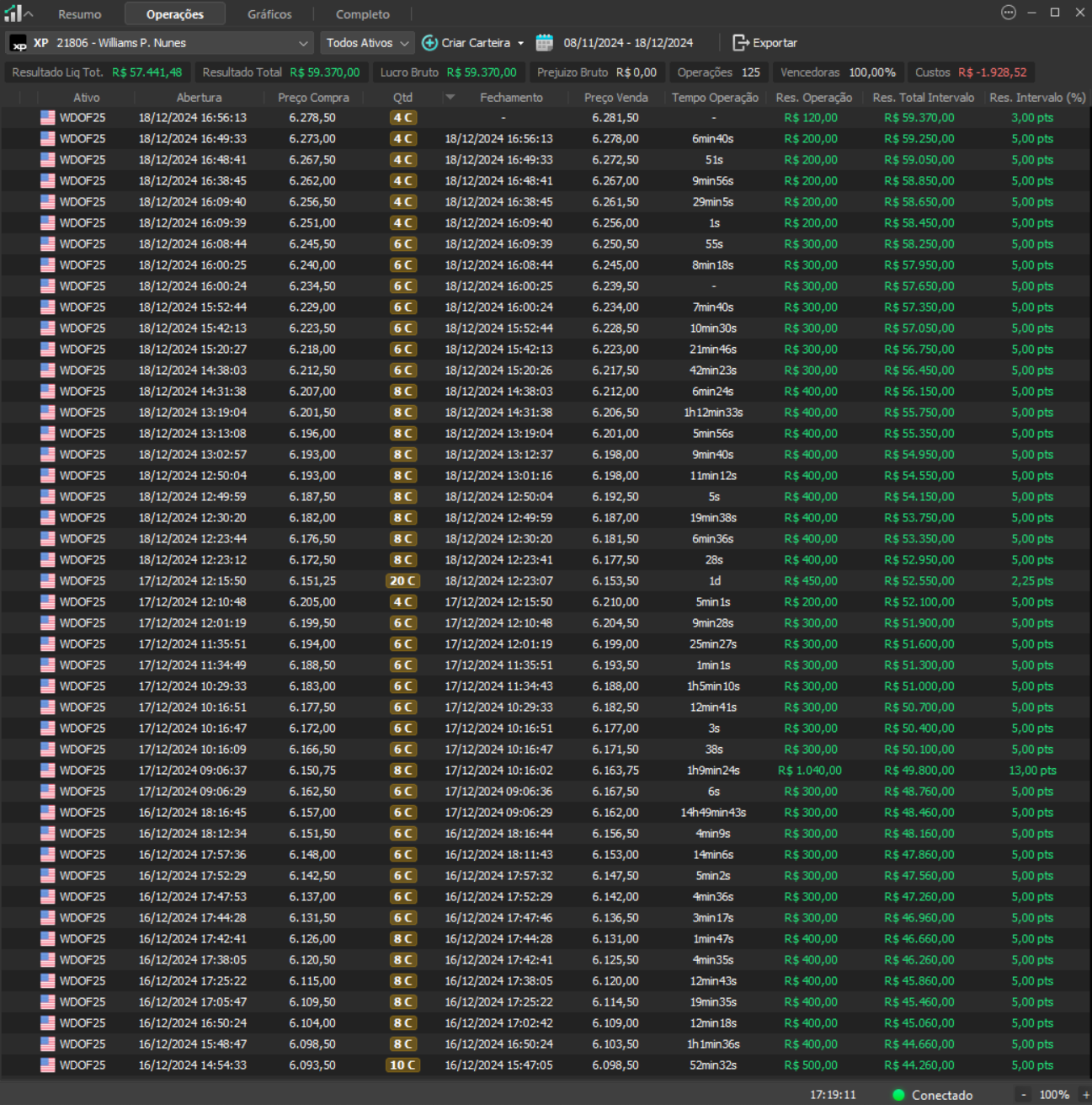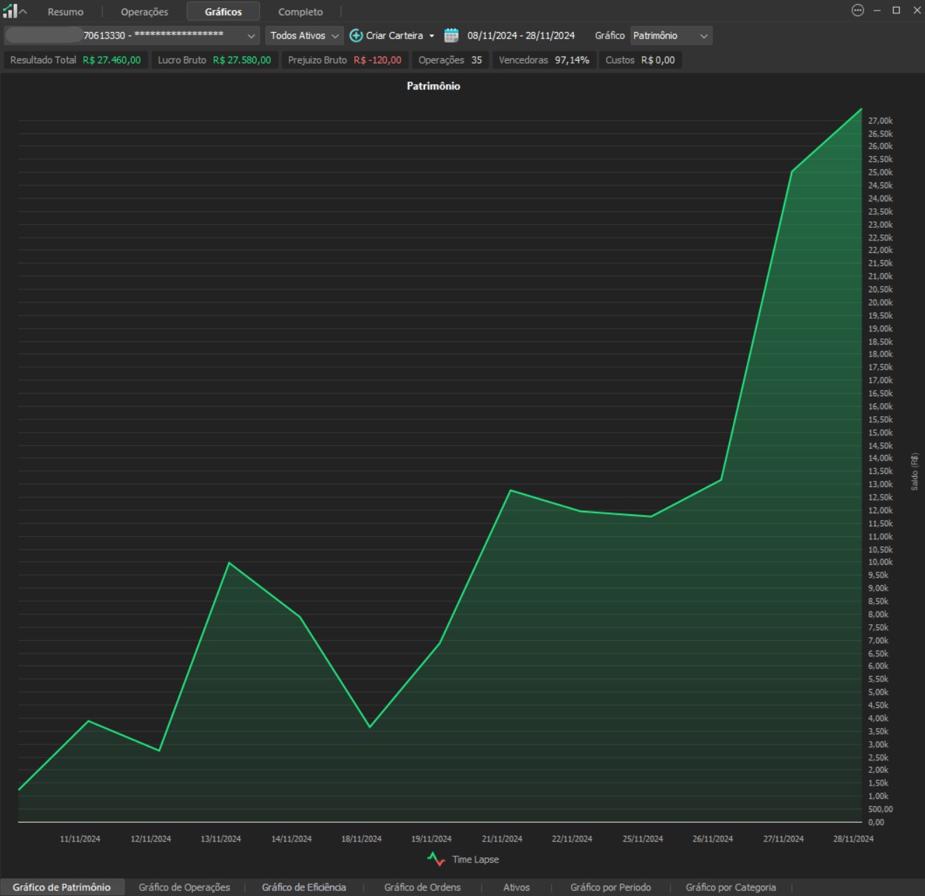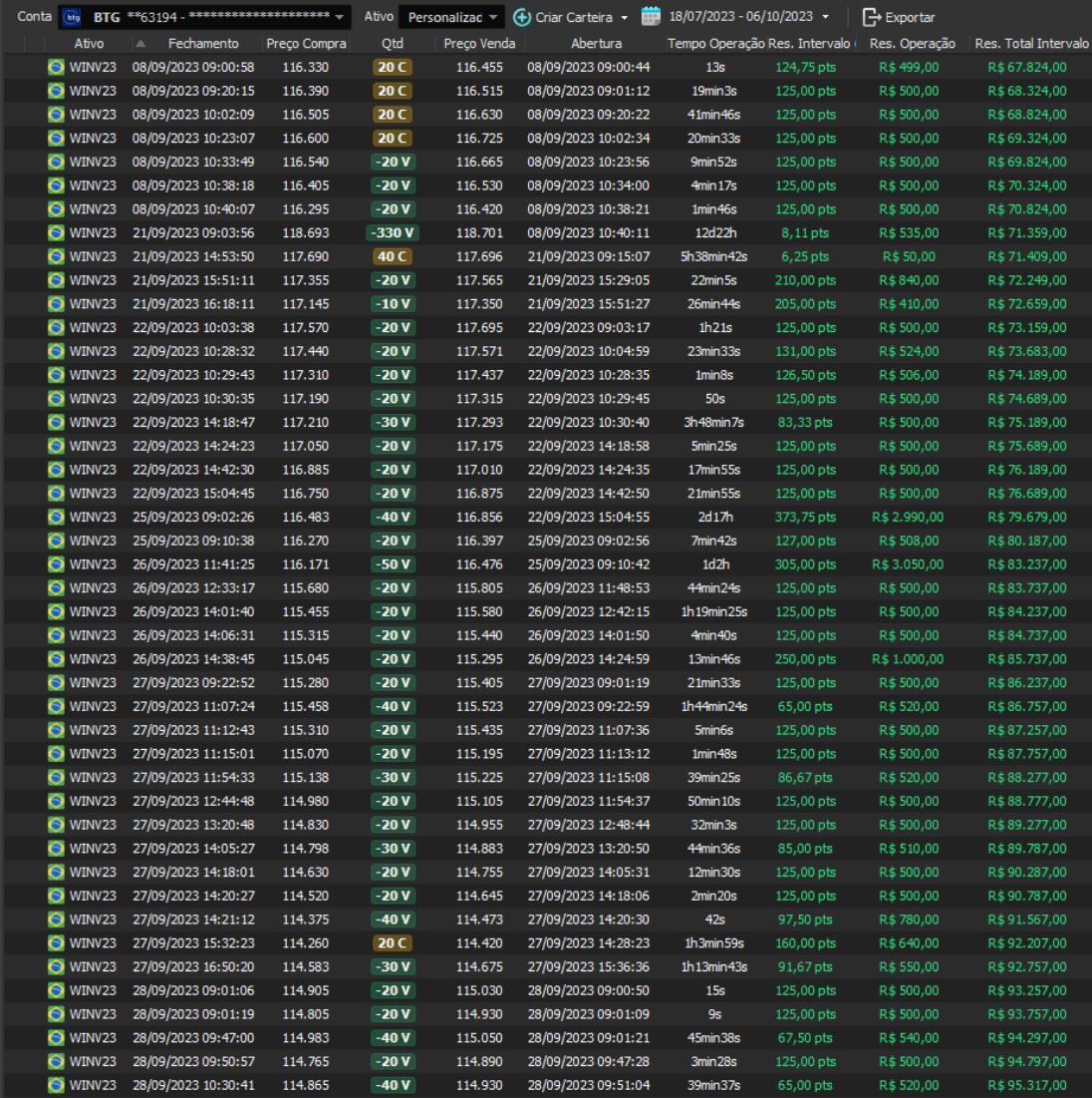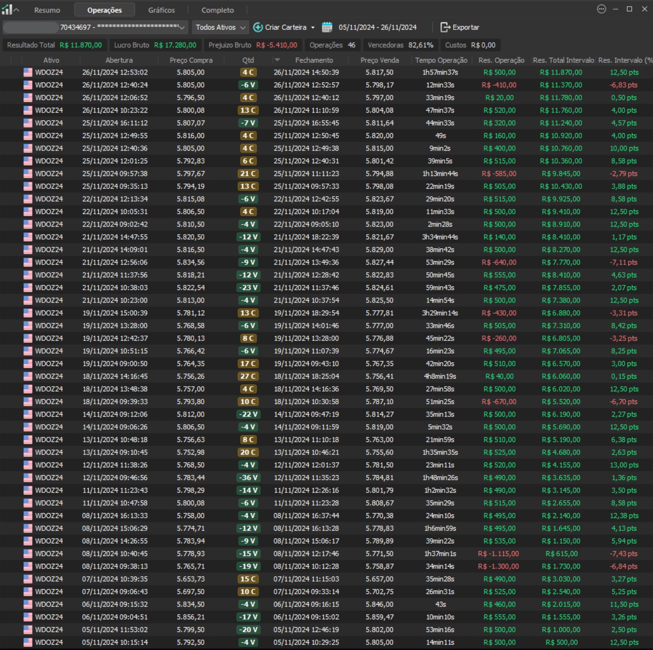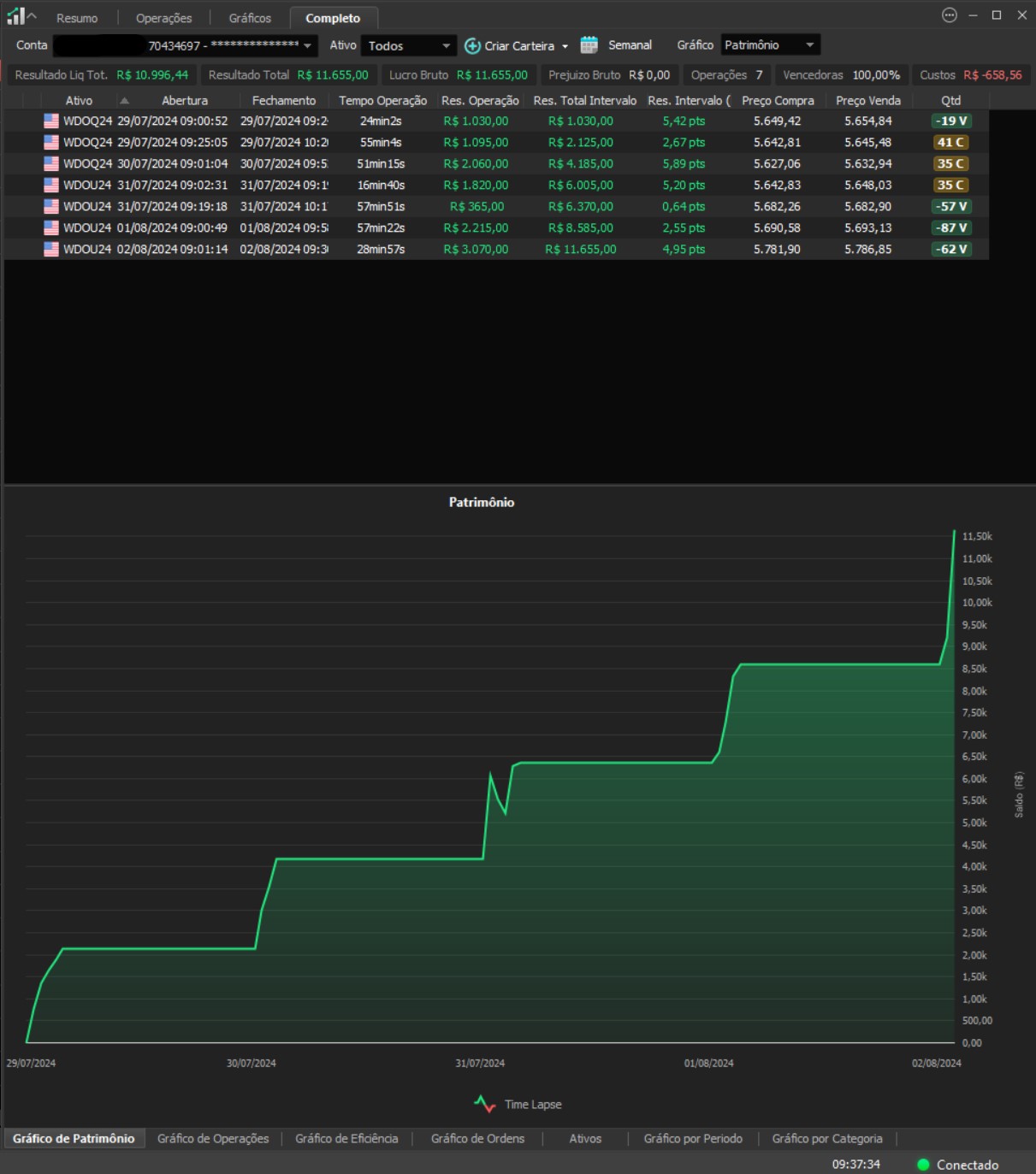 "Os resultados abaixo foram apurados em janelas reais, com capital estruturado em arquitetura híbrida: apenas uma fração é utilizada como margem operacional, enquanto o restante permanece em renda fixa de alta liquidez, contribuindo com juros no resultado total. Isso permite executar volatilidade com disciplina, manter governança de risco e reduzir a dependência de 'all-in' emocional."