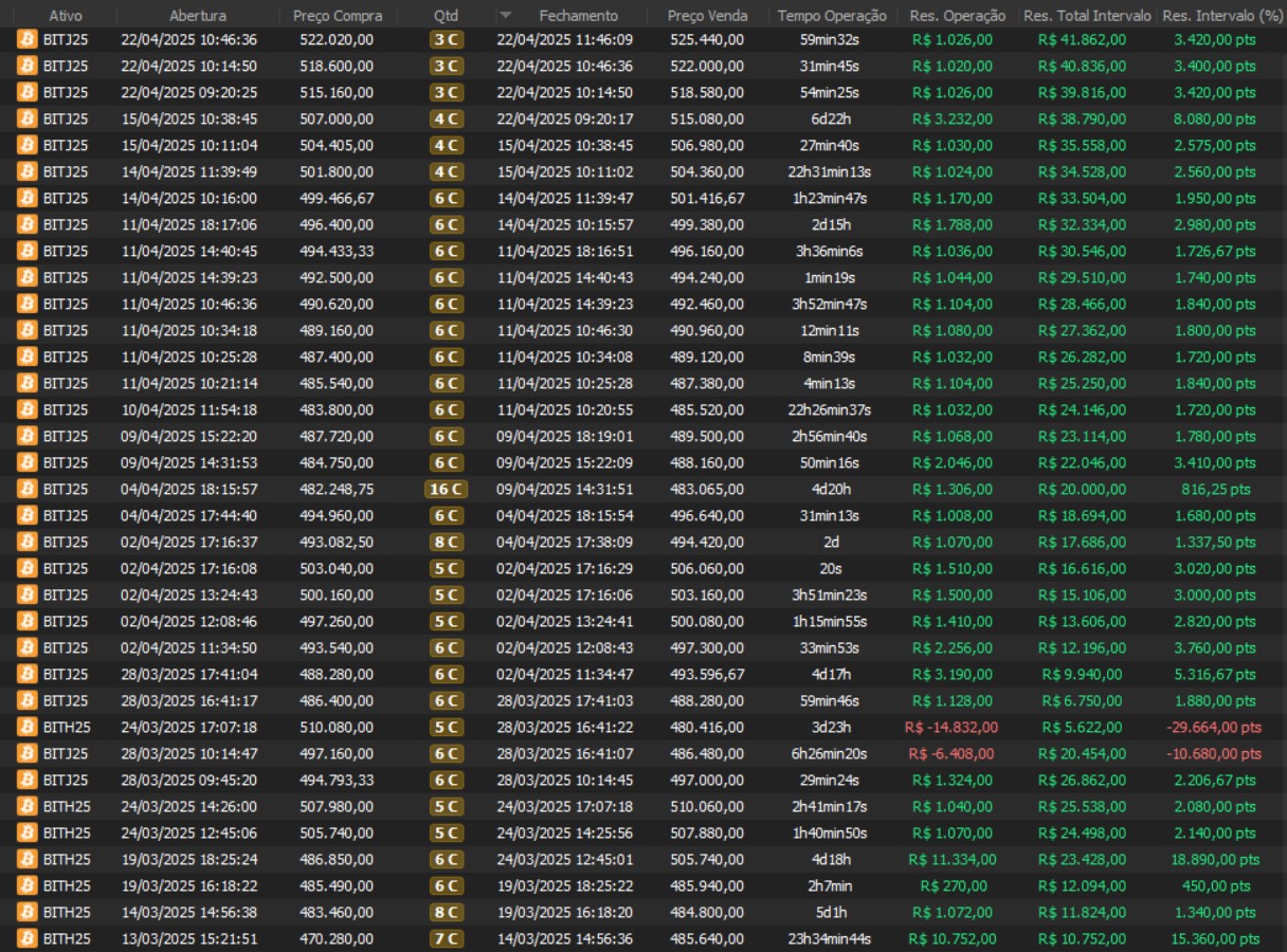 Modelos validados e documentação em Bitcoin, Mini Índice, Dólar Futuro, Soja, Milho, Boi, entre outros.