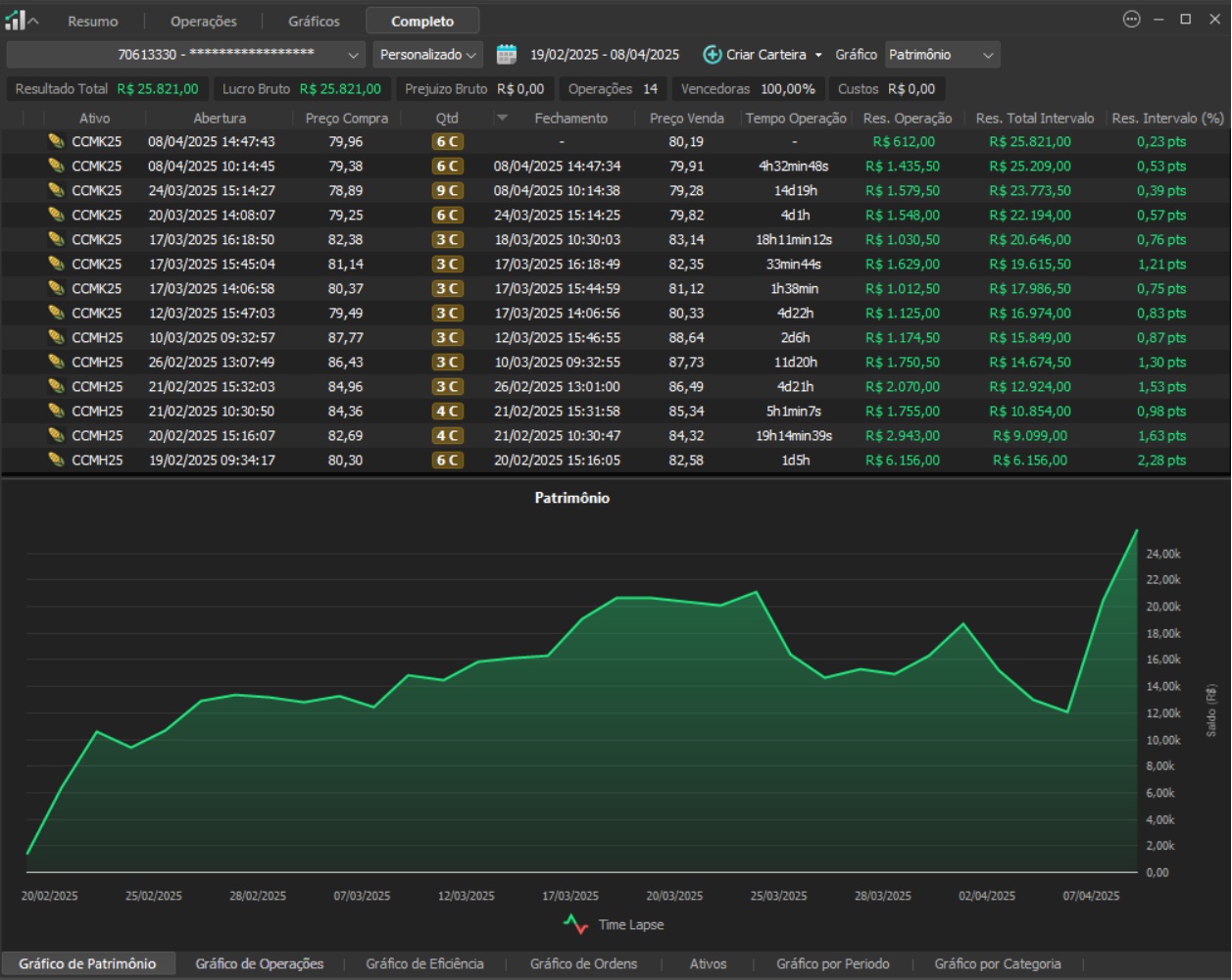 Não há promessa de prazo. Resultados dependem do mercado, do ativo, da execução e do risco assumido. O foco é consistência e disciplina, não narrativa.